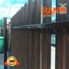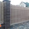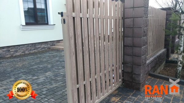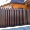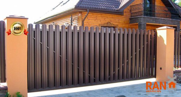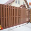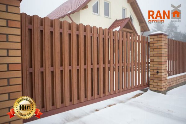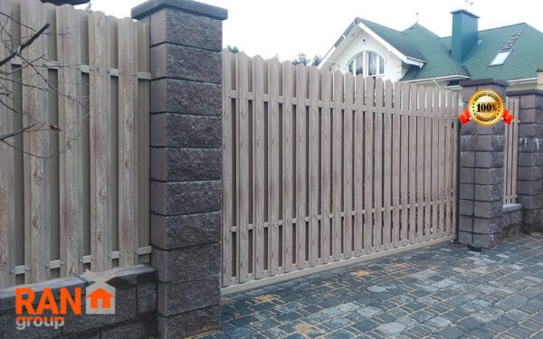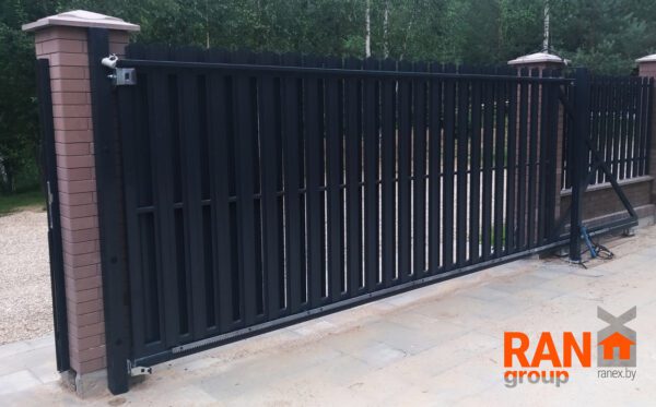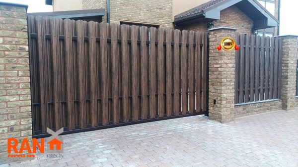 Ворота-штакетник хотя со стороны являются достаточно классическим решением, однако в случае накладного способа монтажа штакетника с выступающим верхом и выравниванием в общей пролётной линией штакетника являются одними из самых сложных по конструктиву ворот. Сложность обуславливается тем обстоятельством, что у данного типа ворота не одна нижняя несущая направляющая шина, а две. Вторая устанавливается сверху и называется верхней дублирующий направляющей шиной. При этом, данный тип ворот оснащается дополнительным опорным несущим столбом, который и несёт на себе весь весь ворот.
